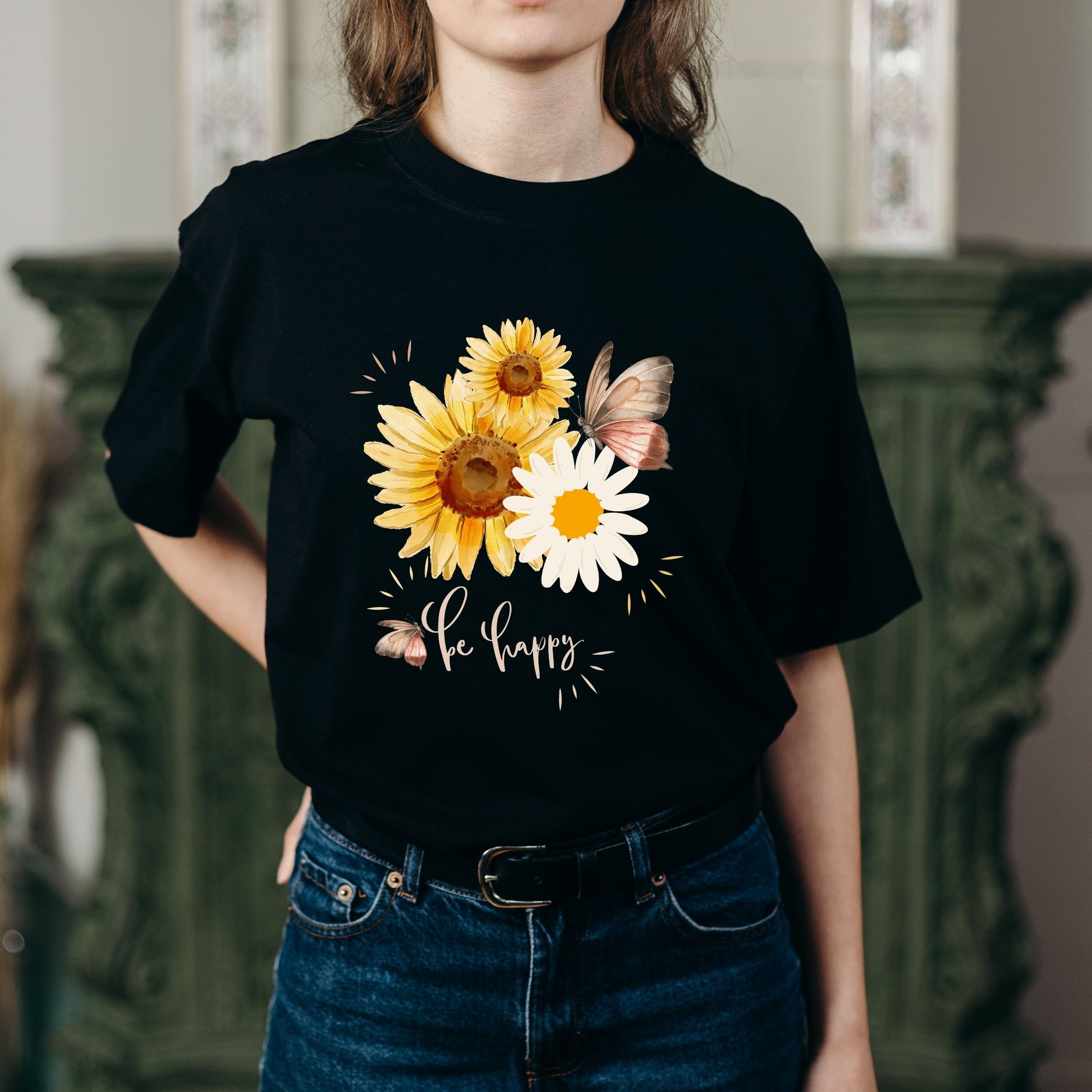 Elevate your everyday wardrobe with this sophisticated cotton t-shirt featuring a vibrant sunflower and an uplifting "Be Happy" print. Crafted from soft, breathable cotton, it ensures comfort throughout the day while adding a subtle touch of positivity to your style. Perfect for effortless, chic casual wear that inspires joy wherever you go.